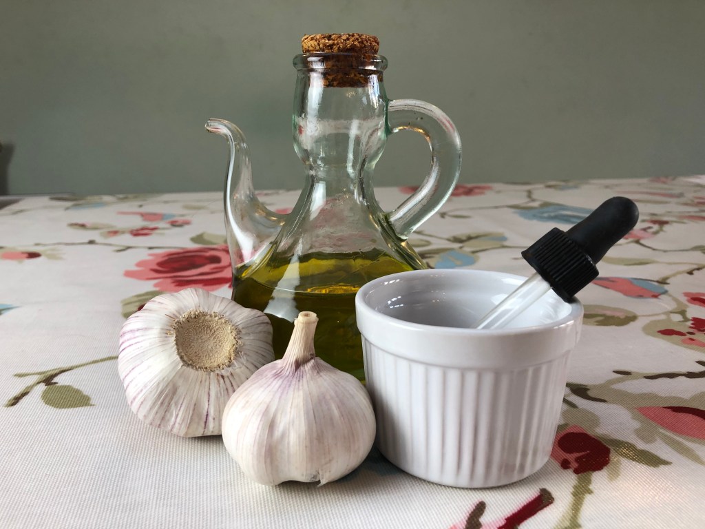 In these instances, I recommend saturating one end of a cotton ball (not cotton bud or tip – never use these) with the oil and simply place it gently into the ear. Do not push it in deeply, simply enough so it doesn’t fall out. I have been known to place a plaster (band-aid) over the cotton wool to keep it in place. The garlic oil will seep into the surrounding tissue and do its job.