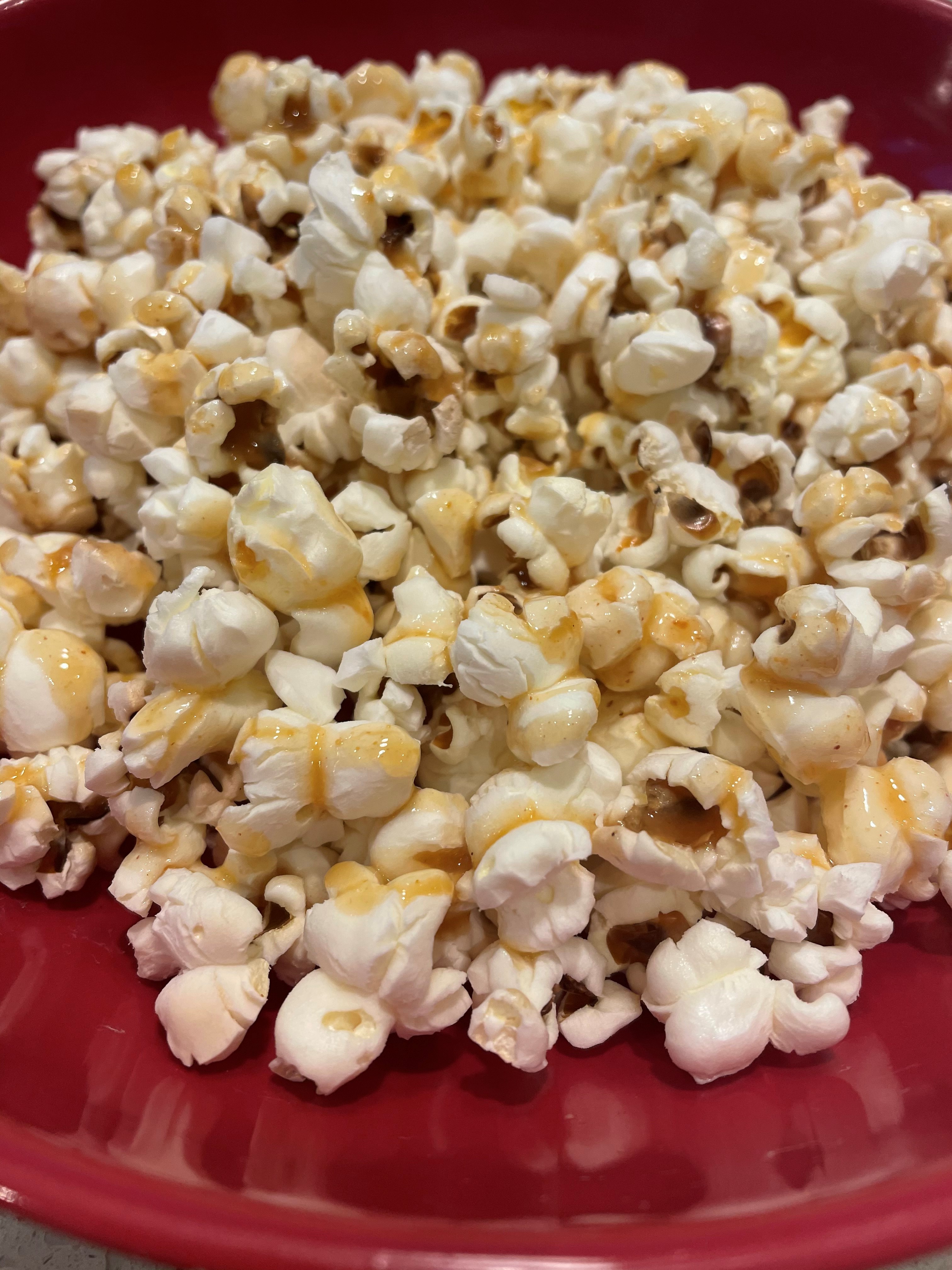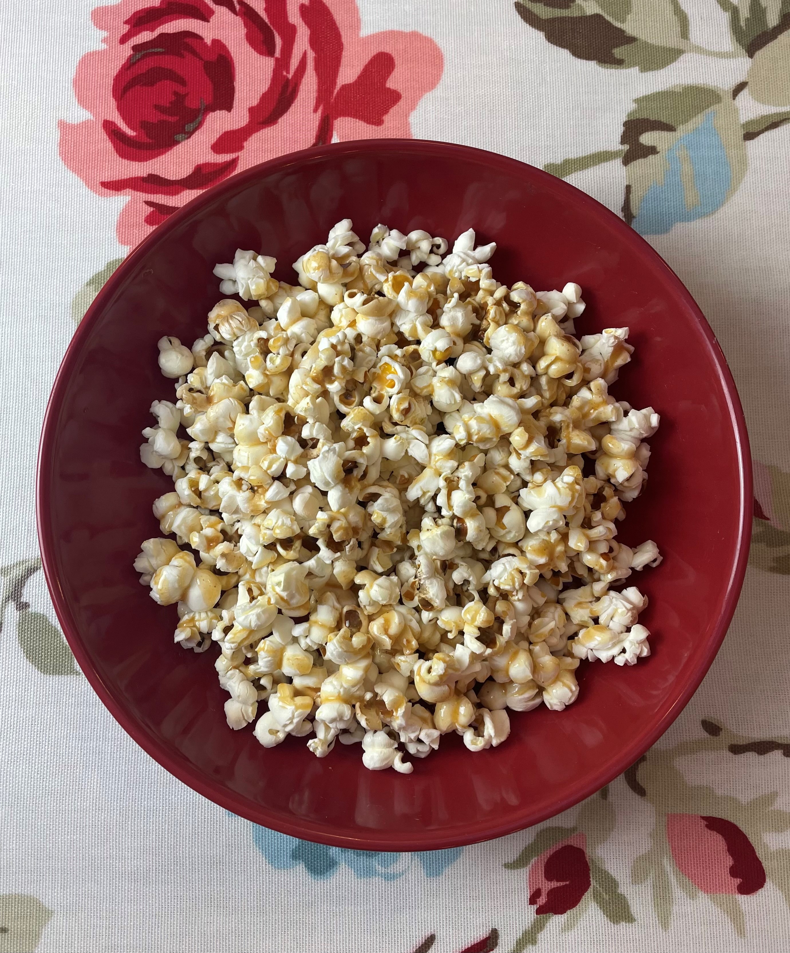 This method allows the pan to cool just a touch, which minimises burning. Usually it means that all the kernels successfully pop and there are none wasted.